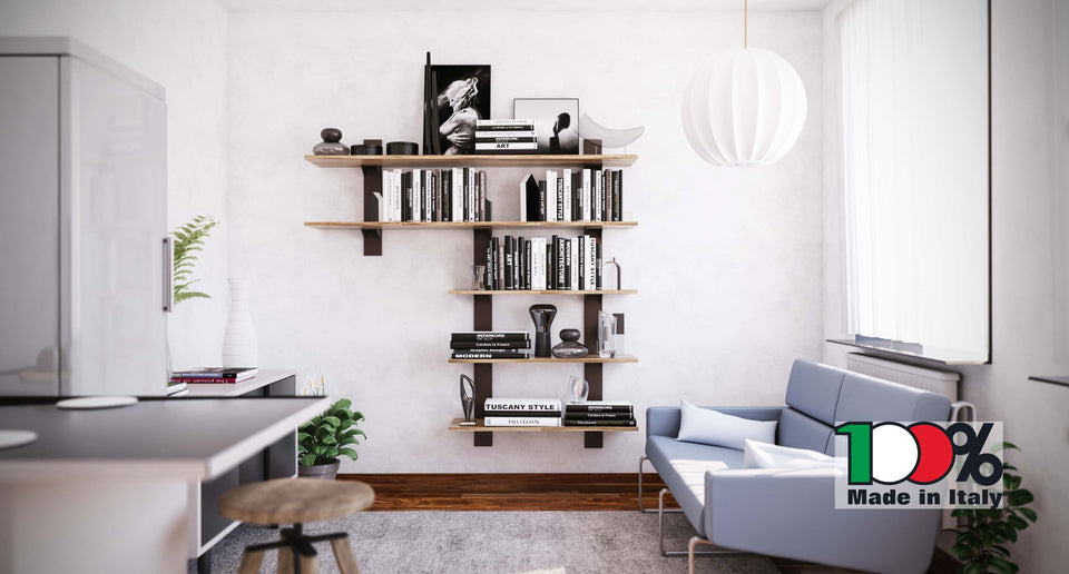 Tower is a modern and modular wall-mounted bookcase composed of metal studs and wooden shelves.