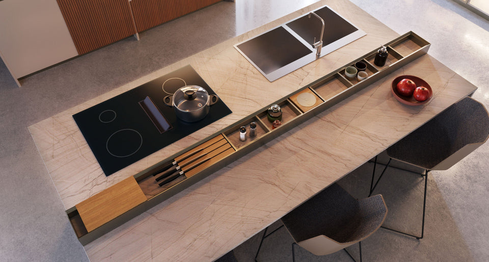 Bro si trasforma in un canale attrezzato dal design essenziale e sofisticato, progettato per completare isole e penisole e migliorare l’operatività del piano di lavoro. Realizzato in alluminio, offre una soluzione modulare e personalizzabile che consente di organizzare lo spazio in modo pratico ed efficiente. È configurabile liberamente con accessori dedicati, come moduli con presa elettrica, portacoltelli, taglieri, portabottiglie e divisori, per avere sempre tutto a portata di mano.