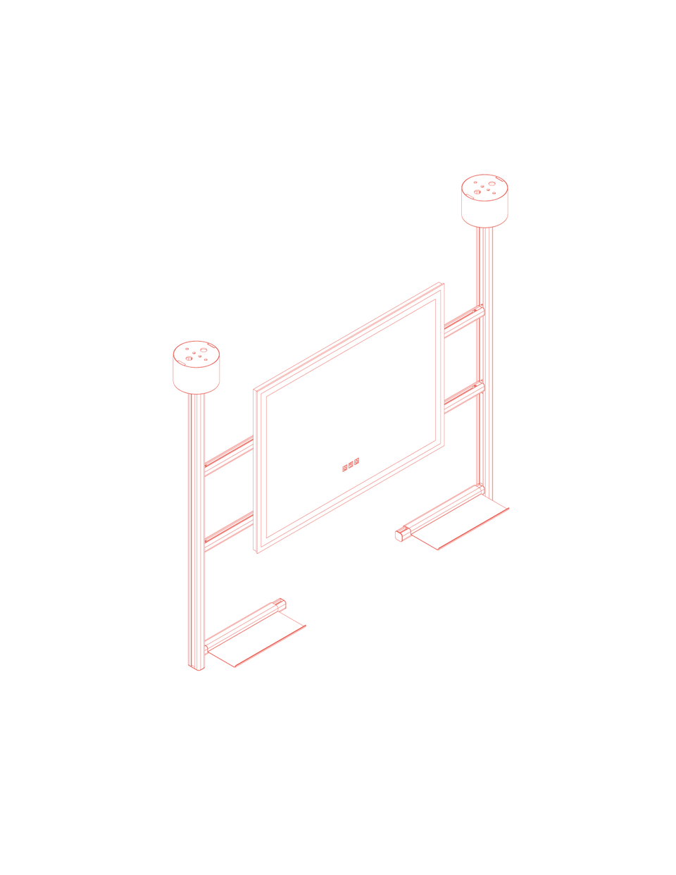 Il sistema per il bagno IO-D è formato da due montanti di alluminio fissati al soffitto e de traversi orizzontali che sorreggono la specchiera rettangolare. I montanti e la specchiera sono integrati con illuminazione LED e la struttura è configurabile con mensole portaccessori, bicchiere in metallo e portasciugamano.